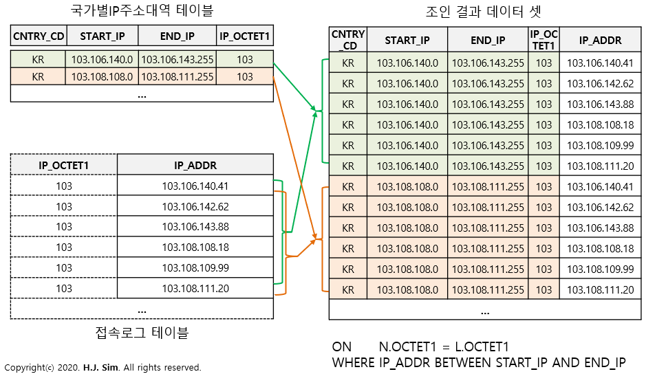 국가별 IP주소대역이 시작과 끝이라는 범위로 표현되어 있기 때문에 Equal 조인이 불가능합니다. 어쩔 수 없이 크로스 조인(카테시안 곱) 후 BETWEEN 연산자를 사용해 접속로그 IP주소에 해당되는 국가코드를 찾도록 필터링해야 합니다.