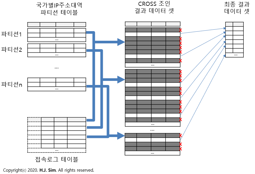 크로스 조인의 부하를 제거하기 위해서는 Equal 조인이 가능하도록 '국가별IP주소대역' 테이블 아키텍처를 변경해 Equal 조인이 가능한 컬럼을 추가해줘야 합니다.