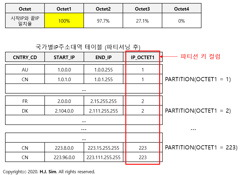부수적으로 국가별IP주소대역 테이블은 대용량의 테이블과 조인되므로 건수는 적지만(190,350건) 옷뎃1별로 파티셔닝 하였습니다.
