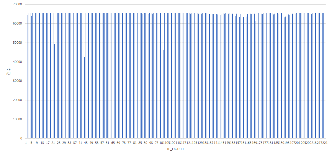 한국인터넷정보센터에서 다운로드한 국가별IP주소대역 CSV 파일(2020년 7월 기준) 데이터를 기반으로 시작IP와 끝IP의 옷뎃별 일치율을 점검한 결과는 아래와 같습니다.