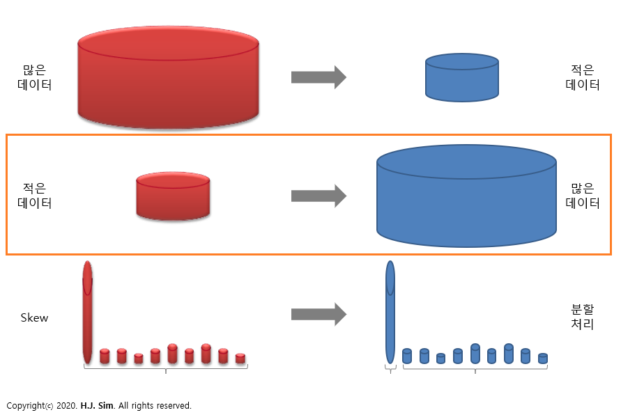 즉, 적은 데이터를 많게 만들어(상세화하여) 데이터의 분포도를 좋게 만들고 Equal 조인이 가능하도록 테이블 아키텍처를 변경해주는 작업이 필요합니다.