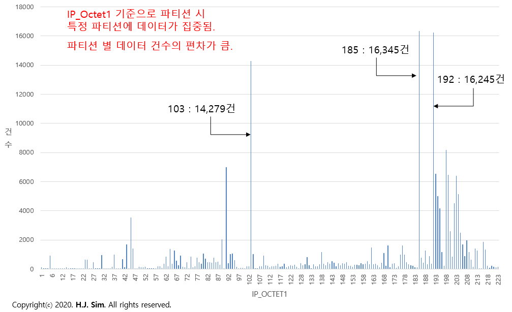 특히 파티션 키 컬럼인 IP_OCTET1 컬럼의 데이터 분포를 확인해보면 파티셔닝 전략이 성공적이었다고 볼 수는 없을 것입니다.