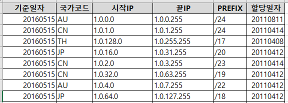 한국인터넷정보센터에서 다운로드한 국가별IP주소대역 CSV 파일의 구조는 아래와 같습니다.