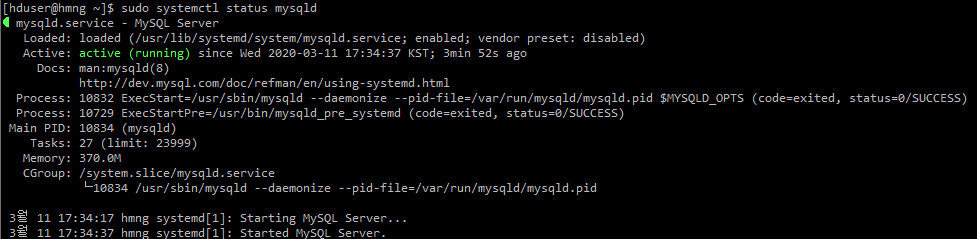 옵션 변경이 완료되었으면, mysql 서비스를 시작하고 서비스가 제대로 구동되었는지 확인해 보겠습니다.