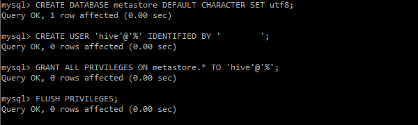 mysql> GRANT ALL PRIVILEGES ON metastore.* TO 'hive'@'%';