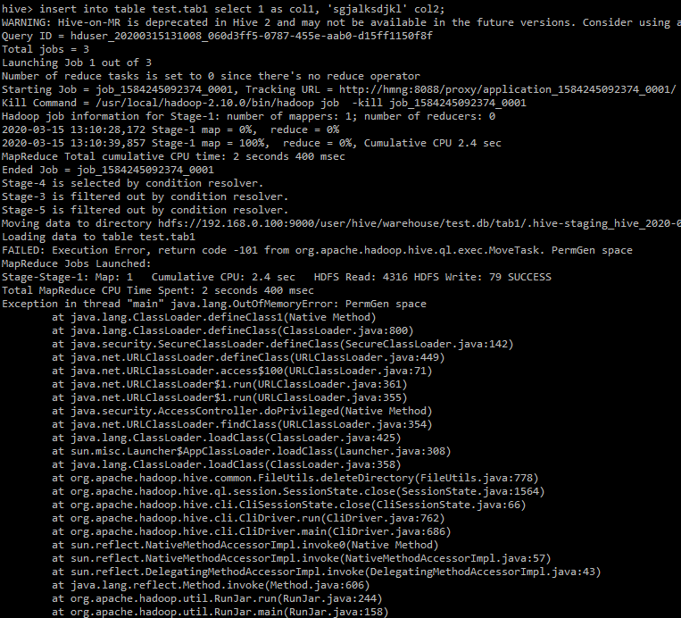 Hive 설치 후 간단한 DML 문을 실행하였는데, 아래와 같이 OutOfMemoryError: PermGen space가 발생하였습니다. 실행했던 HQL이 단순하게 하나의 row를 삽입하는 문장이었는데 메모리 부족이 발생하다니, 초기 설정 그대로 테스트를 해보는 것은 욕심이었나봅니다.
