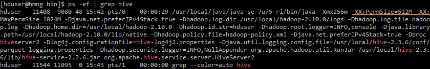 위에 Hive를 실행하는 자바프로세스 옵션에 우리가 방금 설정한 PermSize와 MaxPermSize가 추가되어 있는 것을 확인할 수 있을 것입니다.