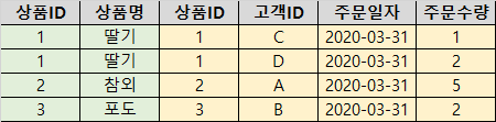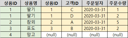 신규 상품인 망고(상품ID : 4)가 '상품' 테이블에 입력되었습니다. 하지만 신규 상품인 망고의 고객 주문이 발생하지 않는다면, '고객주문상품' 테이블에는 망고의 상품ID 값 '4'가 존재할 수 없습니다. 상품ID '4'는 오직 '상품' 테이블에만 존재하게 됩니다.