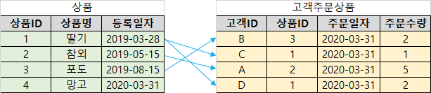'상품' 테이블과 '고객주문상품' 테이블을 예로 들어보겠습니다.