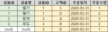 아래는 조인 종류를 설명할 예제 데이터입니다.