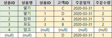 왼쪽 상품 테이블에만 데이터가 존재하는 로우의 오른쪽 고객주문상품 테이블 컬럼 값은 NULL로 표시됩니다.