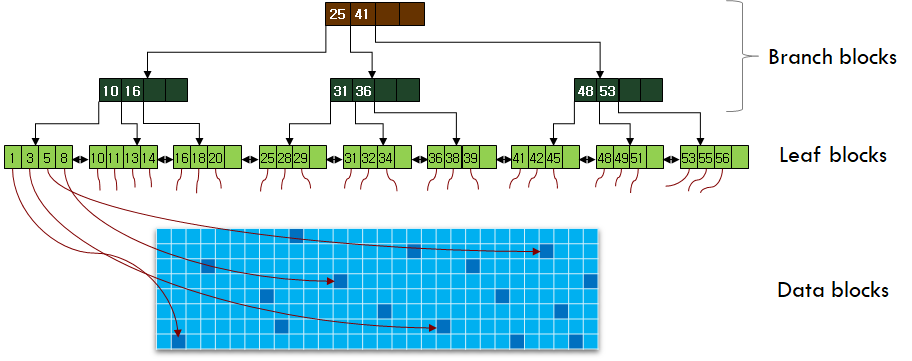 인덱스에서는 책의 분류기호 대신에 테이블의 컬럼 값을 사용해 데이터 위치를 검색합니다. 컬럼의 값을 B-Tree 구조체에 입력하고, 루트노드부터 리프노드까지 짧은 액세스 단계를 거쳐 검색 대상 컬럼의 값이 위치한 로우의 위치(Rowid)를 빠르게 찾을 수 있게 됩니다. ( 이 포스팅의 주 목적이 B-Tree가 아닌 관계로 상세한 입력/검색 절차는 생략하겠습니다. )