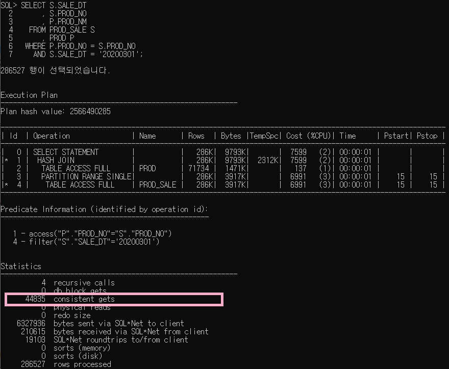 오른쪽 조인을 사용한 쿼리의 consistent gets 값은 '44,835'입니다.