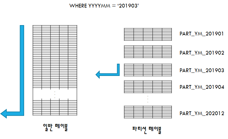 만약, YYYYMM 컬럼 값을 기준으로 파티션이 된 테이블에서 YYYYMM='201903'인 값을 찾는다면 YYYYMM='201903'에 해당하는 파티션만 탐색하게되므로 블록 액세스가 감소됩니다.