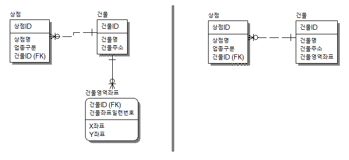 아래 ERD는 상점 정보와 상점이 위치한 건물의 정보를 저장하기 위한 엔터티를 보여주고 있습니다.