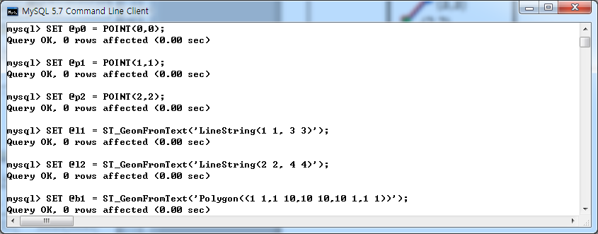 공간 관계 함수의 테스트를 위해 아래 테스트 데이터를 사용자 변수에 저장하도록 하겠습니다.