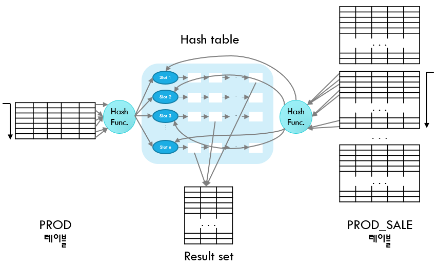 실행계획을 보면 PROD_SALE 테이블과 PROD 테이블을 FULL TABLE SCAN 하여 HASH 조인했음을 알 수 있습니다. 두 테이블 중 크기가 상대적으로 작은 PROD 테이블이 BUILD 테이블이 되어 해쉬 테이블을 만들고 PROD_SALE 테이블이 PROBE 테이블이 되어 해시 조인했음을 확인할 수 있습니다.