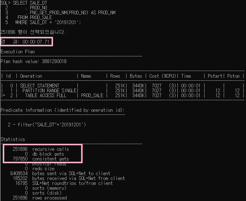 PROD_SALE 테이블에서 SALE_DT 값이 '20191201'인 데이터는 251,896건입니다. 251,896건의 recursive calls이 발생했으니 데이터 건수만큼 함수가 호출되었음을 확인할 수 있습니다.