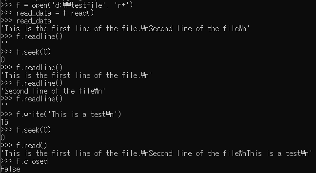 | >>> f = open('d:\\testfile', 'r+') >>> read_data = f.read() >>> read_data 'This is the first line of the file.\nSecond line of the file\n' >>> f.readline() '' >>> f.seek(0) 0 >>> f.readline() 'This is the first line of the file.\n' >>> f.readline() 'Second line of the file\n' >>> f.readline() '' >>> f.write('This is a test\n') 15 >>> f.seek(0) 0 >>> f.read() 'This is the first line of the file.\nSecond line of the file\nThis is a test\n' >>> f.closed False |