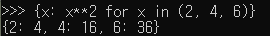 | >>> {x: x**2 for x in (2, 4, 6)} {2: 4, 4: 16, 6: 36} |