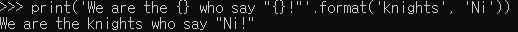 | >>> print('We are the {} who say "{}!"'.format('knights', 'Ni')) We are the knights who say "Ni!" |