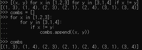 | >>> combs = [] >>> for x in [1,2,3]: ... for y in [3,1,4]: ... if x != y: ... combs.append((x, y)) ... >>> combs [(1, 3), (1, 4), (2, 3), (2, 1), (2, 4), (3, 1), (3, 4)] |