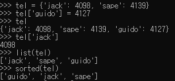 | >>> tel = {'jack': 4098, 'sape': 4139} >>> tel['guido'] = 4127 >>> tel {'jack': 4098, 'sape': 4139, 'guido': 4127} >>> tel['jack'] 4098 >>> list(tel) ['jack', 'sape', 'guido'] >>> sorted(tel) ['guido', 'jack', 'sape'] |