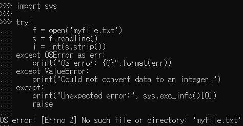 | >>> import sys >>> >>> try: ... f = open('myfile.txt') ... s = f.readline() ... i = int(s.strip()) ... except OSError as err: ... print("OS error: {0}".format(err)) ... except ValueError: ... print("Could not convert data to an integer.") ... except: ... print("Unexpected error:", sys.exc_info()[0]) ... raise ... OS error: [Errno 2] No such file or directory: 'myfile.txt' |