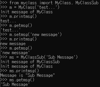 | >>> from myclass import MyClass, MyClassSub >>> m = MyClass('test...') Init message of MyClass >>> m.printmsg() test... >>> m.getmsg() 'test...' >>> m.setmsg('new message') >>> m.printmsg() new message >>> m.getmsg() 'new message' >>> ms = MyClassSub('Sub Message') Init message of MyClassSub Init message of MyClass >>> ms.printmsg() Message is "Sub Message" >>> ms.getmsg() 'Sub Message' |