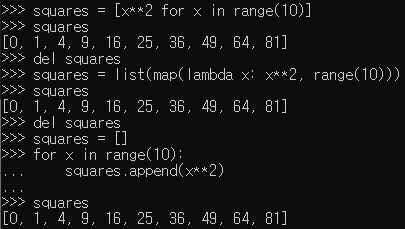 | >>> squares = [] >>> for x in range(10): ... squares.append(x**2) ... >>> squares [0, 1, 4, 9, 16, 25, 36, 49, 64, 81] |