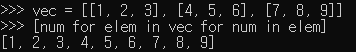 | >>> vec = [[1, 2, 3], [4, 5, 6], [7, 8, 9]] >>> [num for elem in vec for num in elem] [1, 2, 3, 4, 5, 6, 7, 8, 9] |
