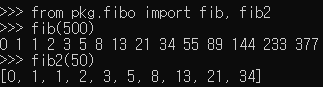| >>> from pkg.fibo import fib, fib2 >>> fib(500) 0 1 1 2 3 5 8 13 21 34 55 89 144 233 377 >>> fib2(50) [0, 1, 1, 2, 3, 5, 8, 13, 21, 34] |