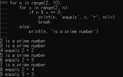 | >>> for n in range(2, 10): ... for x in range(2, n): ... if n % x == 0: ... print(n, 'equals', x, '*', n//x) ... break ... else: ... print(n, 'is a prime number') ... 2 is a prime number 3 is a prime number 4 equals 2 * 2 5 is a prime number 6 equals 2 * 3 7 is a prime number 8 equals 2 * 4 9 equals 3 * 3 |