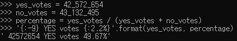 | >>> yes_votes = 42_572_654 >>> no_votes = 43_132_495 >>> percentage = yes_votes / (yes_votes + no_votes) >>> '{:-9} YES votes {:2.2%}'.format(yes_votes, percentage) ' 42572654 YES votes 49.67%' |