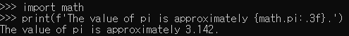 | >>> import math >>> print(f'The value of pi is approximately {math.pi:.3f}.') The value of pi is approximately 3.142. |