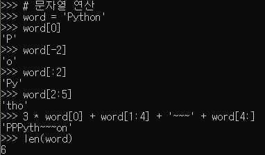 | # 문자열 연산 >>> word = 'Python' >>> word[0] 'P' >>> word[-2] 'o' >>> word[:2] 'Py' >>> word[2:5] 'tho' >>> 3 * word[0] + word[1:4] + '~~~' + word[4:] 'PPPyth~~~on' >>> len(word) 6 |