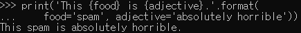 | >>> print('This {food} is {adjective}.'.format( ... food='spam', adjective='absolutely horrible')) This spam is absolutely horrible. |