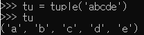 | >>> tu = tuple('abcde') >>> tu ('a', 'b', 'c', 'd', 'e') |