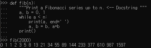 | >>> def fib(n): ... """Print a Fibonacci series up to n. <-- Docstring""" ... a, b = 0, 1 ... while a < n: ... print(a, end=' ') ... a, b = b, a+b ... print() ... >>> >>> fib(2000) 0 1 1 2 3 5 8 13 21 34 55 89 144 233 377 610 987 1597 |