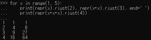 | >>> for x in range(1, 6): ... print(repr(x).rjust(2), repr(x*x).rjust(3), end=' ') ... print(repr(x*x*x).rjust(4)) ... 1 1 1 2 4 8 3 9 27 4 16 64 5 25 125 |