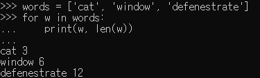 | >>> words = ['cat', 'window', 'defenestrate'] >>> for w in words: ... print(w, len(w)) ... cat 3 window 6 defenestrate 12 |