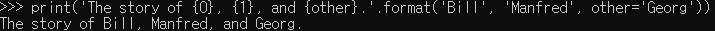 | >>> print('The story of {0}, {1}, and {other}.'.format('Bill', 'Manfred', other='Georg')) The story of Bill, Manfred, and Georg. |