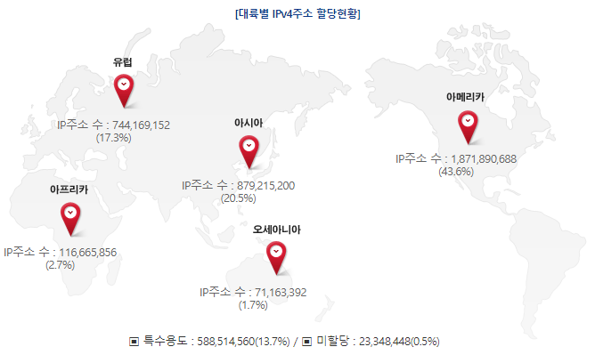 우리가 외부 네트워크에 접속하기 위해서는 우선 IP(이 포스트에서는 IPv4 기준으로 설명)를 할당받아야 합니다. 그런데 이 IP라는 것이 표현상의 한계(000.000.000.000 ~ 255.255.255.255)가 있기 때문에 IP 주소의 수도 한계가 있습니다. 따라서 국가별로 사용할 수 있는 IP대역을 정의하여 IP의 무분별한 사용을 제어하고 있습니다.