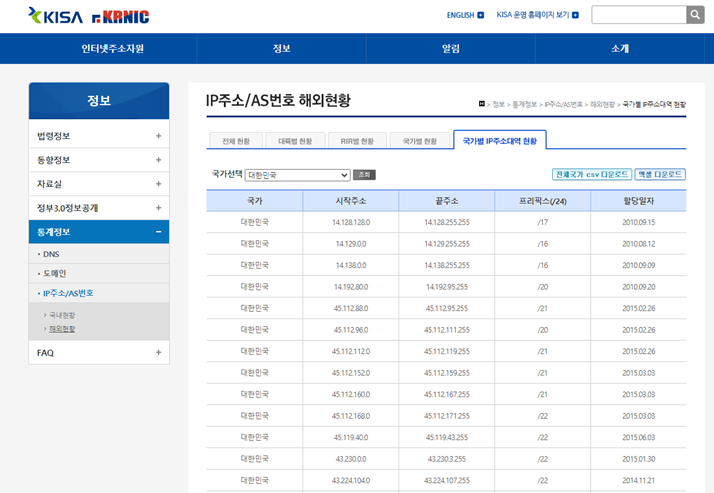 국가별 IP주소대역은 한국인터넷정보센터(KRNIC)에서 확인 가능하며, CSV 파일로 다운로드도 가능합니다.