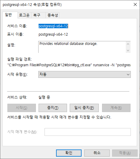 postgreSQL 서비스가 정상적으로 가동되었다면 아래 다이얼로그처럼 '서비스 상태'가 '실행 중'으로 변경된 것을 확인하실 수 있습니다.