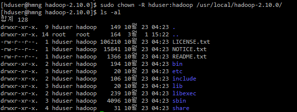 압축 해제된 파일들의 사용자와 그룹은 hduser와 hadoop으로 변경해줍니다.