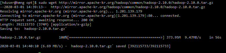 > sudo wget http://mirror.apache-kr.org/hadoop/common/hadoop-2.10.0/hadoop-2.10.0.tar.gz