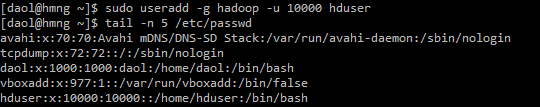 방금 생성한 hadoop 그룹에 속하는 사용자 hduser를 만들어보겠습니다.