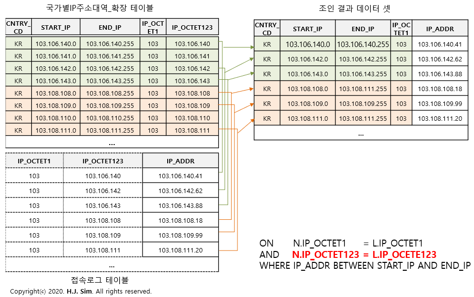 국가별 IP주소대역이 시작과 끝이라는 범위로 표현되어 있기 때문에 Equal 조인이 불가능합니다. 어쩔 수 없이 크로스 조인(카테시안 곱) 후 BETWEEN 연산자를 사용해 접속로그 IP주소에 해당되는 국가코드를 찾도록 필터링해야 합니다.