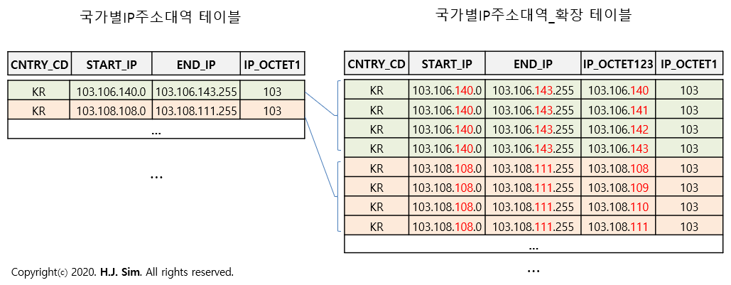 이번 포스트의 핵심은 '국가별IP주소대역' 테이블을 이용해 '국가별IP주소대역_확장' 테이블 데이터를 만드는 것이라고 볼 수 있습니다.